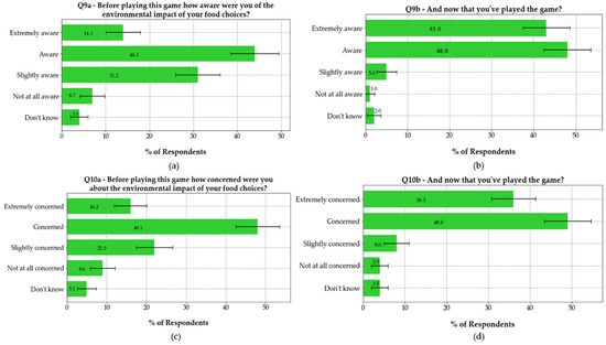 Figure 9 shows the results of questions 9a, 9b, 10a and 10b of the OMS survey. These questions aimed to gauge the impact of the game on individuals’ awareness and concerns about food greenhouse gas emissions. The percentage of individuals who were ‘extremely aware’ of the environmental impact of their food choices increased from 14.3%, 95% CI (10.4%, 17.9%) to 43.0%, 95% CI (37.4%, 48.6%). The percentage of individuals who were ‘extremely concerned’ increased from 16.2%, 95% CI (12.1%, 20.3%) to 36.3%, 95% CI (31.0%, 41.6%). The percentages of individuals who were ‘extremely aware’ of and ‘extremely concerned’ about the environmental impact associated with their food choices increased after playing the game. Furthermore, there was a greater increase in individuals’ awareness of their environmental impact than their concern.