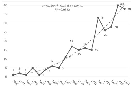 According to López López [58], three phases of behavior can be identified in the line of evolution of the study in any area of knowledge, and these phases are: precursors, exponential growth, and linear growth. The presence of two of them is observed in the analysis of CSR in SMEs. The precursor phase is characterized by a reduced production focused on taking the first steps within the subject. It goes from the year 2000 to 2007, with a productivity index of 3.57 articles/year.