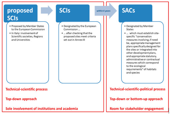 Figure 1 shows how the site designation process envisioned in the Habitats Directive works, from the preliminary identification of SCIs to the designation of SACs; moreover, it sums up the main aspects concerning the processes, approaches, and stakeholders’ engagement. As portrayed in the image, the designation process is characterized by a rigid, hierarchical separation of the involved institutional tiers of government, and by technocratic approaches grounded only upon scientific data, in the absence of any participation of local communities and stakeholders who might possibly be involved in the sites’ management. In other words, the first part of the process (SCI identification and designation), driven by scientific data and led by institutions, takes a top-down approach that leaves out local communities’ and economic stakeholders’ interests; such exclusion may—or may not—be compensated in the final part (SAC establishment and management), depending on how each member state designs the process.