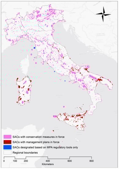 Special Areas of Conservation in Italy for which the official designation acts refer to conservation measures, management plans or (exclusively) MPA regulatory tools (source: Author’s own elaboration; Natura 2000 sites’ boundaries retrieved from ftp://ftp.minambiente.it/PNM/Natura2000/TrasmissioneCE_dicembre2017/, last access on December 31, 2019).