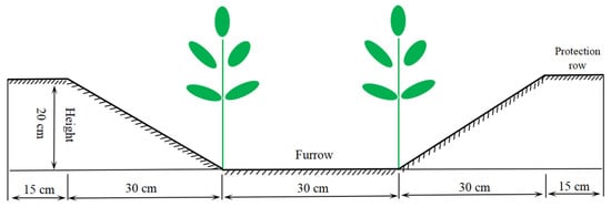 In the greenhouse, the plots were built from west to east and double ridges were produced per plot. Each plot area was 3.6 m2 with 6.0 m in length, 0.6 m in width, 0.2 m in height and 0.3 m in furrow width (Figure 1). Tomato cultivar “Haidi” seedlings of 20 d were transplanted. It is a type commonly available in the market. Thirty-four tomato plants were planted in double rows of each plot, with a plant spacing of 0.35 m. Protection rows were set up at the two ends of each plot.