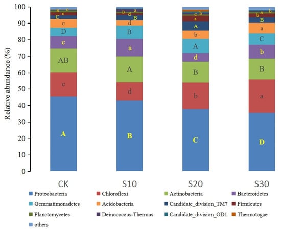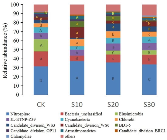 Each of the trace bacteria makes up less than 1% of the bacterial community, but they make up less than 2% of the community as a whole. Of the trace bacteria, Nitrospirae was the largest group, for which the relative abundances of S10, S20 and S30 were 1.18, 1.13 and 1.07 times that of CK (Figure 4). The relative abundance of Chlorobi in S10, S20 and S30 was 1.80, 1.68 and 1.31 times that in CK. Similarly, the relative abundance of Cyanobacteria in S10, S20 and S30 was 0.63, 0.97 and 1.07 times that of CK, and the relative abundance of Armatimonadetes in S10, S20 and S30 was 2.16, 1.86 and 1.58 times that of CK. In addition, Chlamydiae was not detected in S10 but its relative abundance in S20 and S30 was 0.67 and 2.22 times that in CK.