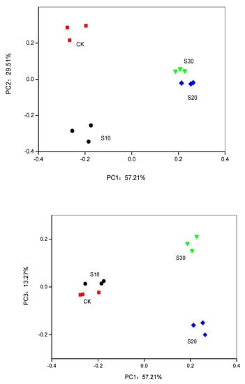 The results of PCA in Figure 5 indicated that PC1, PC2 and PC3 (the first three principal components) contributed 57.21%, 29.51% and 13.27%, respectively. CK, S10, S20, and S30 were remarkably separated by PC2 and PC3, showing that the bacterial community of the four treatments differed from each other. In the case of PC1, there was no significant separation between S20 and S30, which revealed that bacterial community of the two treatments had no significant difference. However, S20 or S30 was obviously separated from CK and S10, which was a response to the significant differences of these bacterial communities.
