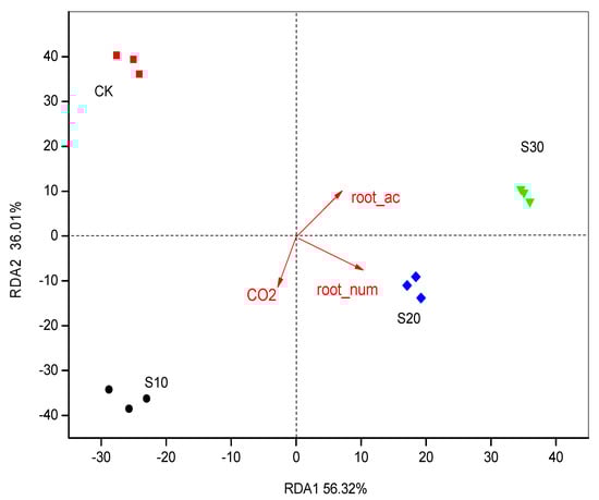 The correlation between the soil bacterial community and environmental factors in root-soil was analyzed, however, only the significant results are shown in Figure 6. The results revealed that the bacterial community of CK was positively related to root activity but was negatively related to root forks and soil CO2 flux. S10 was negatively related to root activity and positively related to root forks and soil CO2 flux. However, S20 had a significant positive correlation with root activity, root forks and soil CO2 flux, respectively. S30 was negatively correlated with soil CO2 flux and positively correlated with root activity and root forks. CK, S10, S20 and S30 were significantly separated by soil CO2 flux and root activity, however, the effect of root activity on CK and S20 was similar. Root forks had similar effects on S10, S20 and S30 but separated them from CK.