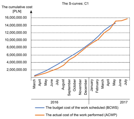 - A comparison of the obtained S-curve areas for the budgeted costs and the actual costs in relation to the actual cost shows that costs are generated at a much faster rate than budgeted in the second stage of implementing works. According to the received 6th degree polynomials, for half of the planned duration of work, the scheduled work and expenditure advancement is approx. 24%, while the actual advancement with the actual duration is approx. 28%;