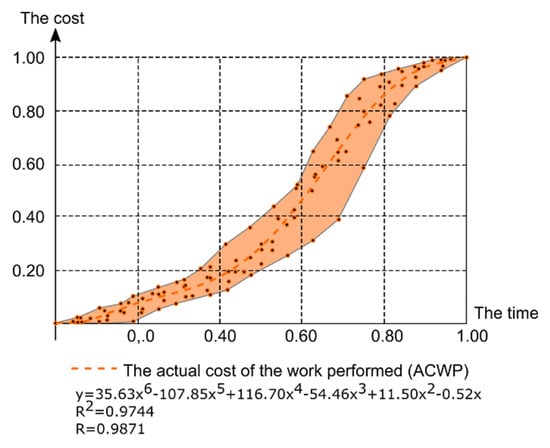 For the area of the S-curve of actual costs in relation to the budgeted cost, the obtained 6th degree polynomial in 96% describes the course of the S-curve, and the correlation coefficient reaches the value of 0.98.