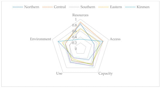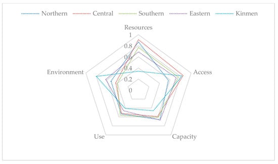 - In situation 1, Kinmen ranked last among the regions, including southern Taiwan, central Taiwan, northern Taiwan, eastern Taiwan, and Kinmen. In situation 2, Kinmen ranked the same. Figure 7 and Figure 8 compare Kinmen and the other regions of Taiwan in situations 1 and 2, respectively. In both figures, Taiwan is divided into four regions, namely north, central, south, and east, to facilitate its comparison with Kinmen.