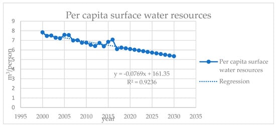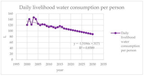 - Daily livelihood water consumption per person: According to estimations based on the WPI data, the daily livelihood water consumption per person in Kinmen will be reduced to approximately 88.71 L/person by 2030 (Figure 13).