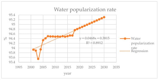 - Water popularization rate: According to estimations based on the WPI data, the water popularization rate in Kinmen will be reduced to approximately 95.3% because of the increase in the immigrant population by 2030 (Figure 10).