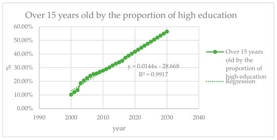- People over 15 years old according to their proportion of higher education: According to estimations based on the WPI data, the proportion of people over 15 years old with higher education in Kinmen will increase to approximately 56% by 2030 (Figure 11).