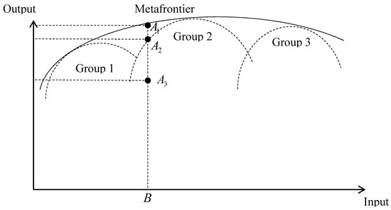 According to the meta frontier model of O’Donnell et al. (2008), we take a system of single input and output and assume that DMUs are divided into three groups, labeled 1, 2, and 3. In this study, we regard each city in the respective three regions (upstream, midstream, downstream) as a group [43]. Figure 1 expresses the method of calculating the input and output combination A3 of one DMU in group 2, with the consideration of an unexpected output. The equation for calculating the technology gap ratio (TGR) is: