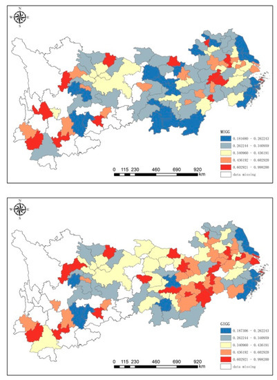 To compare the overall characteristics of IGG in the YREB at different frontier levels, the average IGG efficiencies of the 108 cities in the YREB during 2003–2016 were mapped using spatial statistics. As shown in Figure 2, the meta IGG (MIGG) and the group IGG (GIGG) efficiencies did not change much in the upstream region, suggesting that the actual technical efficiency under the front edge of the upstream city group is similar to the potential technical efficiency under the common front edge, i.e., the improvement space of the upstream cities’ IGG efficiency is not large. The MIGG efficiencies of the middle and downstream cities are significantly lower than GIGG efficiencies, indicating that the actual IGG efficiencies of the middle and downstream cities are higher. But if traditional methods were used to build the metafrontier, the conclusion that the IGG efficiency value was lower would be drawn, resulting in large deviations in the calculated results from the actual values.