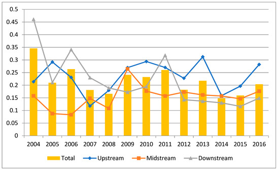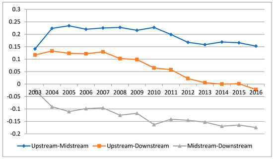 As shown in Figure 3, the TGR gap of the three basins in the YREB shows a trend of decreasing fluctuation. Before 2014, the difference of TGR between upstream and downstream regions was positive, and was shrinking. However, by 2014, the difference was negative, indicating that the actual technology level of the downstream region exceeded that of upstream region. The steady improvement in the efficiency of IGG might be due to the superior geographical location of the downstream region, the large degree of economic openness, the relatively advanced technology and management levels, the rich availability of funds and the ability to attract foreign investment and produce more talent. It is worth noting that the TGR gap between the midstream and the downstream regions is gradually widening. This is likely because of the relatively closed geographical location of the basin and a relatively backward level of economic development, blocking any technological advancements.