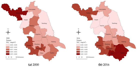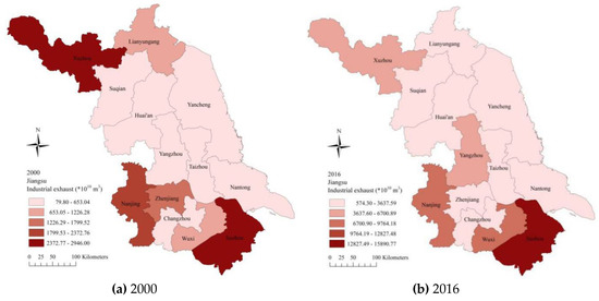 Air pollutants (industrial waste gas emissions (IWGE) and nitrogen dioxide emissions (NO2)): Many indicators can be used for measuring atmospheric pollutants, such as industrial waste gases, sulfur dioxide, industrial dust, nitrogen oxide emissions, and soot emissions [27]. However, industrial dust, soot emissions, and other indicators are not available for Jiangsu Province. Thus, IWGE and NO2 data for Jiangsu Province during 2000–2016 were selected as the representative atmospheric pollutants comprising the dependent variables. The distribution of these two pollutants in 2000 and 2016 is shown in Figure 1 and Figure 2. Jiangsu Province is a large manufacturing province with many industrial manufacturing enterprises, and thus, it produces a large amount of IWGE. Therefore, the IWGE value was selected as a representative indicator of atmospheric pollution. In addition, according to the Jiangsu Environmental Bulletin, the environmental air quality in 13 districts and cities did not reach the required standard in 2018. In particular, the NO2 concentrations were significantly higher than the standard in Nanjing, Wuxi, Xuzhou, Changzhou, and Suzhou. NO2 is a typical atmospheric pollutant and the main pollutant in economically-developed regions.
