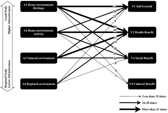 This study established the interconnection between four attractive features and four recreational values of heritage (Figure 1). Sixty-six interviewees indicated that heritage features produce health benefits; for example, “The entire open space, natural light, and gallery are the characteristics of architecture. We can stay inside without a time limit. So, I feel quite relaxed” (A03). Forty-four interviewees indicated that the heritage features induce self-growth; for example, “It is great to be able to regenerate ancient architecture. ... It is quite good for the government to give this ancient architecture a new life… In this fast-paced world, it shows me the original value of life and [that we have] not lost our direction. There is no way to enjoy the many processes of life if you have not settled down” (B04). Eighteen interviewees indicated that heritage features produce social benefits; for example, “Although the architecture is older on this site, I think the architecture has retained its characteristics. … I may tell my friends about this place. If they have the opportunity to come here, I will introduce this place to them” (D05).