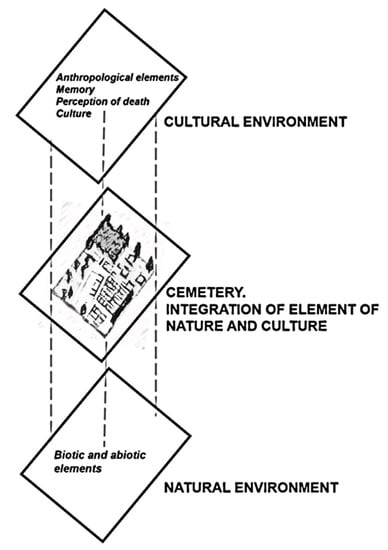 A model of a cemetery was developed as a multidimensional space based on the legal regulations in Poland and written sources in the fields of landscape architecture, architecture, urban ecology, and history. Our review, therefore, concentrates exclusively on the cemeteries in urban environments, with a special focus on pro-environmental solutions and values. We have done literature research by using Google Scholar. The multi-faceted nature of cemeteries is manifested in the complexity of roles imposed on this space. Cemeteries, along with their main function as a burial site, play a number of roles: they serve as sacrum zone [26,27,28], archive, an open-air museum [13,29,30,31], a park [17,32], and an important part of the city’s natural habitat. They are considered a reserve of flora and fauna [33,34,35,36,37] and also a place of social importance e.g., [18,38,39,40,41,42,43,44] by researchers all over the world, regardless of their cultural background. Cemeteries are pieces of space made of elements of natural and cultural environments. In recent years, many researchers have recommended for cemeteries to be considered holistically, taking into consideration nature protection and cultural heritage [39,40,45,46]. The literature study has shown that cemeteries should be treated as multi-faceted space (Figure 1); therefore, while arranging its space, integration of solutions related to the natural and cultural environment is necessary. Especially in the face of the dynamically occurring climate changes, which are a consequence of excessive exploitation of environmental resources.
