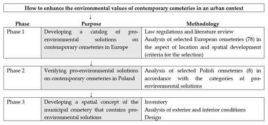 This paper is organized into four sections. The first part presents the theoretical background of the methodological framework (multi-faceted cemetery model). The second part presents the research framework proposed by explaining its main phases and criteria for the selection of countries and cemeteries. The third part presents the catalog of pro-environmental solutions for European cemeteries (on the basis of a 78-feature analysis), assessment of Polish contemporary cemeteries in the aspect of implementation of the solutions, and the spatial concept of the municipal cemetery in Gniezno where the pro-environmental solutions are to be developed. In the last section, the results are discussed and provided.