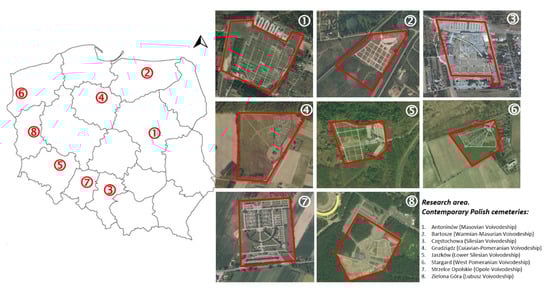 Spatial distribution of the selected Polish contemporary cemeteries (8 objects), including division into 16 voivodeships (left) and spatial layout of cemeteries in an aerial photograph (right). Own elaboration based on [72].