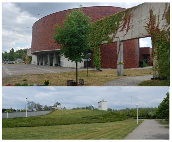 Architecture and spatial elements. In compliance with the provisions currently in force in Poland, the necessary elements of a cemetery’s development are fencing, passages between tomb fields with a width of minimum 50 cm, parking spaces, water intakes, cubature buildings (funeral parlor, cemetery chapel), as well as burial space and vegetation (discussed in separate items) [9,49]. Only at the cemeteries in Antoninów and Częstochowa pro-environmental solutions were identified in terms of architecture. A multi-functional building (administration, funeral parlor, crematorium) was built in Antonów, whose spatial form evokes associations with Slavonic burial mounds. It has an exposed pediment decorated with raw columns (here you can find the echoes of the "Woodland Crematorium" portico by architect Gunnar Asplund). The eco-friendly nature of the object is determined by hiding some of the facilities below ground level and covering the roof with greenery (thyme, turf, creeping bushes). In Częstochowa, the ellipse-shaped funeral ceremony building was covered with clinker. The side reinforced concrete wings are monumental support structures for vines (Figure 6).