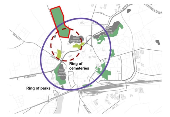 Location of the proposed municipal cemetery in relation to arranged (including cemetery) and unorganized greenery by Długozima, Dutkiewicz, Kosiacka-Beck, et al. [78].