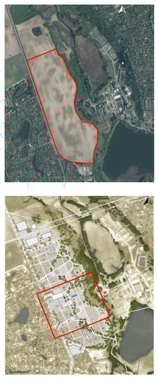 The study area of the municipal cemetery in the town of Gniezno (top) [72]. The spatial concept of the municipal cemetery for Gniezno with the coverage of the investment first stage—the center of the foundation (bottom) by Długozima, Dutkiewicz, Kosiacka-Beck, et al. [78].