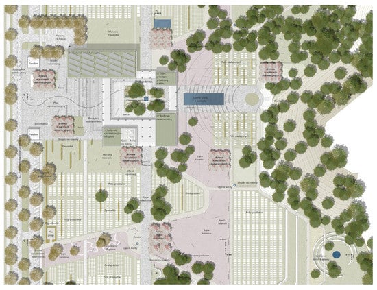 The concept prepared for the area of 20 hectares implies division into stages during construction works, which allows us to fully realize the aims in terms of program, space, environment policy, and rationally manage maintenance costs. The design idea articulated that the multifunctional cemetery, integrated with the local landscape, creates favorable living conditions for various species of plants and animals, increases the natural and landscape values of the town, and, as a result, enhances the quality of residents’ lives. The location of the cemetery in the structure of the city’s green areas is completed by the Gniezno greenery ring and the municipal ecological corridor running north–south (Figure 8).