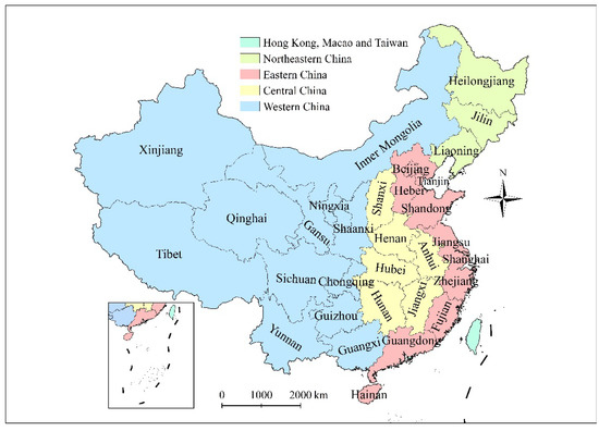 China has four province-level cities (Beijing, Tianjin, Shanghai and Chongqing), and thirty provinces that include 332 prefecture-level cities and 27 prefecture-level counties. Based on their position, all province-level cities and provinces can be classified into four groups: Northeastern, Eastern, Central and Western (Figure 2). The study was conducted in 332 prefecture-level cities and four province-level cities, whose development was more similar to prefecture-level cities instead of provinces. Hong Kong, Macao, Taiwan and prefecture-level counties were excluded from the research because of a lack of data.