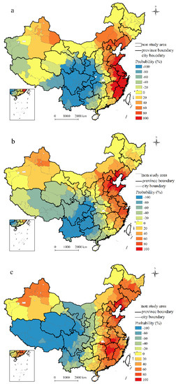 Urban coordinated development is the aggregated results among economic, social and ecological systems. Based on the results of the optimized hot spot analysis every year, we recorded the probability distribution of hot and cold spots of economic, social and ecological development in China during 1995–2015. As shown in Figure 3, in three terms of economic, social and ecological subsystems, there have been some visible geographical characters in China during these years, and different regions distribute significantly different cold spots or hot spots. Hot spots of the economic system are significantly clustered in East China, such as Shandong, Jiangsu, Shanghai, Zhejiang and Fujian. Furthermore, its cold spots mainly distribute in Southwestern China, so urban economic development in China trends to increase gradually from the western inland to the east coast. Then hot spots of the social development spatially located in East China, especially in the Bohai Rim region, and Chongqing, Yunnan and Guizhou are the main areas of cold spots, which means that the spatial pattern of the social subsystem is globally similar to the economic subsystem. Compared with economic and social subsystems, the ecological subsystem distributes less geographical heterogeneity, and the Tibetan Plateau is still an essential zone for cold spots. Generally, hot spots of three subsystems are mainly distributed in East China, and cold spots are significantly clustered in West China, suggesting that an apparent increasing trend exists spatially from the western inland region to the eastern coastal region in China.