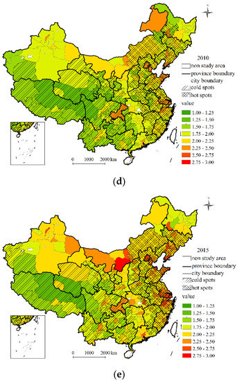 As a benefit of sustained economic, social and ecological development, urban coordinated development in China has been dramatically and globally improved as the urban coordinated development values (Variable D) generally increased during the study period (Figure 4). Moreover, geographical heterogeneity of both hot and cold spots is still very significant, but not robust during the years under investigation. Especially, hot spots in 1995 mainly occurred in the Beijing-Tianjin-Hebei region and East China, then in 2000 hot spots shrunk globally and even disappeared locally, but in 2005–2015 they expanded and sprawled steadily in East China while at the same time they shrunk slowly in Northeast China. In contrast, cold spots still being clustered in Southwest China in these years, have significant and robust geographical characters.