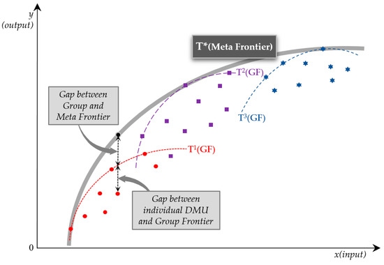 Above all, the metafrontier approach is able to measure the efficiencies of DMUs associated with distinctive technologies and estimate the technical efficiency, TGR, and metafrontier efficiency of each group [8,22,23,24].
