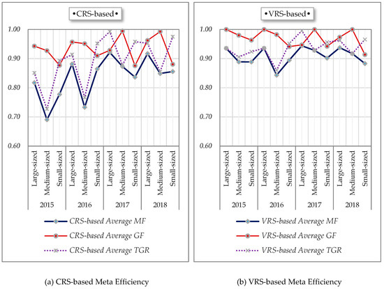 Third, the TGR refers to the distance between the group frontier and the metafrontier, which is also the ratio of the optimal group frontier to the optimal metafrontier for the DMU in question. The closer the ratio is to 1, the closer the optimal group frontier is to the optimal meta-frontier for the DMU concerned. As seen in Table 3 and Figure 3, in terms of the TGR of Korean coffee shop franchisors, the medium-chain franchise group (CRS-based average TGR: 0.8200, VRS-based average TGR: 0.9051) is ranked lower in the TGR, which is farthest away from the metafrontier. Therefore, the medium-chain franchise group requires strategic alternatives to reduce the distance from the group frontier to the metafrontier. Looking at the yearly change of the TGR in Figure 3, the lowest TGR score is in 2015; regardless of the size of franchisors, however, this score exhibits an upward trend.