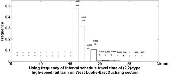 Frequency of train scheduled section travel times (TSSTTs) of a (2,2)-type high-speed rail train on West Luohe–East Xuchang section.