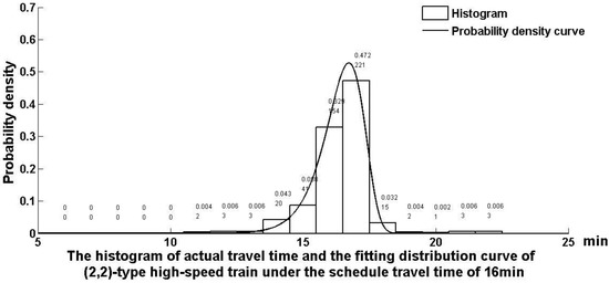 Set the high-speed railway station set as = {East Xuchang, West Luohe, West Zhumadian, East Minggang, East Xinyang, North Xiaogan, East Hengdian, L1L2 block post, Wuhan Gaosuchang, East Wulongquan, North Xianning, North Chibi}, the research scope is from North Chibi station to East Xuchang station. Let represent the West Luohe–East Xuchang section. Figure 1 shows the frequency of TSSTTs used for the trains’ working diagram on West Luohe–East Xuchang section which is type (2,2) section. Noting that data are only accurate to the minute, the figure shows that the set of TSSTTs on type (2,2) section is . This demonstrates a variety of demand for TSSTT in the West Luohe–East Xuchang section. In three months, 16 minutes of TSSTT has appeared 468 times in total, which accounts for 48.1%, the highest frequency of occurrence. The next is 17 minutes which occurs 310 times, accounting for 31.9%. TSSTTs of 24, 26, and 27 minutes are used once, each accounting for 0.1% of the total number. Because TSSTTs greater than or equal to 20 minutes are less, the histograms of TSRTs and the fitted distributions are only plotted for 16–19 minutes, as shown in Figure 2, Figure 3, Figure 4 and Figure 5, and the probability density function fitted is described as . For example, the graph in Figure 2 corresponds to TSSTT 16 minutes, and its probability density function is written as . Other TSSTTs have similar usage and distribution rules.