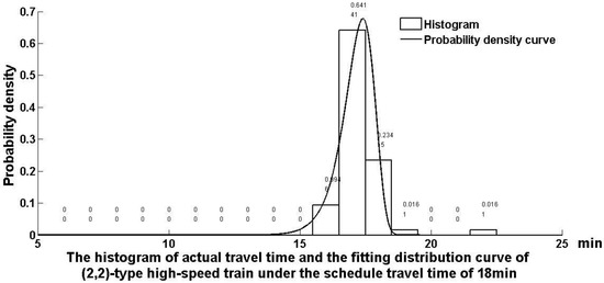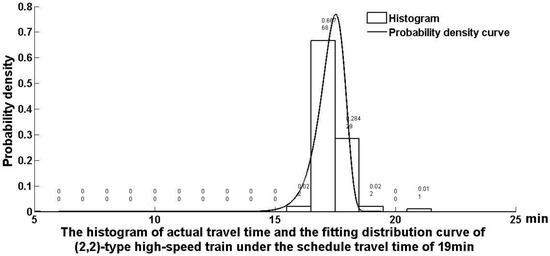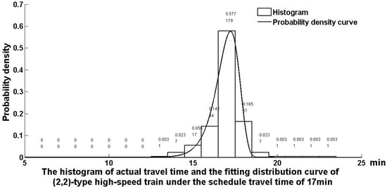 Until now, the high-speed railway has operated from 6:00 a.m. to 10:00 p.m., 16 hours a day. A total of 127 high-speed trains and motor-train units run in the up direction, with an average headway time of 7.56 minutes. A total of 136 high-speed trains and motor-train units run in the down direction, with an average train gap time of 7.06 minutes. Hence, there are fewer knock-on delays among a cascade of high-speed trains, not like urban railway trains, whose running time distribution comply with the rule of the censored model with shifting character [32]. Figure 2, Figure 3, Figure 4 and Figure 5 show that the possibility of a train punctually reaching a station in the time window under an appropriate TSSTT can reach more than 99%. In other words, the reliability of the high-speed train within the 7-minute headway time can reach 99% under the current passenger demand in Wuhan railway administrative area, even in a complex running environment.