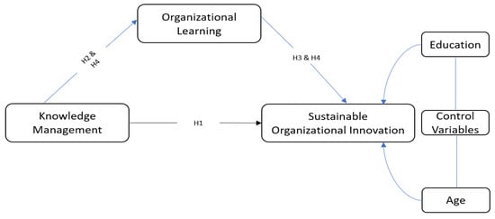 18]. The current research concentrated on the new and original methods of calculating the association between knowledge management, sustainable organizational innovation, and organizational learning. Further, in what way the statistical connection can form virtuous debate concerning innovation procedures. The current research focuses on addressing the literature gaps highlighted above, and it attempted to examine the association between knowledge management and sustainable organizational innovation. At the same time, organizational learning was taken as a mediating variable by addressing the literature gap means the missing statistical link between the studied variables and the literature gap in terms of the garments industry, SMEs, and developing countries like Pakistan.