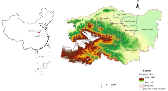 Zhengzhou (112°42′ E–114°14′ E, 34°16′ N–34°58′ N) is located in the Southern part of the North China Plain, downstream of the Yellow River (Figure 1), which has an urban population of 7.137 million and a rural population of 2.744 million. The total area of Zhengzhou is about 7446 km2, accounting for 4.46% of the total area of the Henan Province. Zhengzhou spans two large regions of significantly different elevations (the “second and third levels” of China), and the terrain is tilted from West to East. The Southwestern part is affected by erosion that has formed low hills. Gradually, to the South of the transition to the loess slope plain, erosion has created the alluvial plains of Huanghuai and a small number of dunes and sandy land. There are 124 rivers with variable sizes in the territory; 29 rivers have large drainage areas, and all belong to the Yellow River and Huaihe River systems. The region has well-developed traffic systems and is located in the center of the National Crossroad. Zhengzhou is an essential hub for railways, airports, and highways.