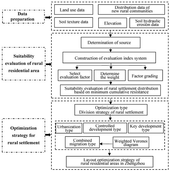 The minimum cumulative resistance (MCR) model was used to evaluate the distribution suitability of rural residential areas in Zhengzhou. The rural residential areas in Zhengzhou were divided into four optimization types, and corresponding optimization strategies were proposed for each type of rural residential area. Firstly, the Zhengzhou Basic Geography Database was constructed by incorporating data for land use, new rural community distribution, soil texture, elevation, soil water erosion, and other features. Secondly, we determined the source of rural residential areas in Zhengzhou, and, then, we determined 11 evaluation factors that were selected from the aspects of topographical geomorphic resistance, land resistance, and location resistance. The subjective and objective methods of the analytic hierarchy process and principal component analysis were combined to determine a weighting method for the factors. The evaluation factors were graded to construct the evaluation index system of rural residential areas in Zhengzhou. The MCR was used to evaluate the suitability of rural residential areas. Thirdly, based on a suitability evaluation, four types of the rural residential areas (namely, urbanization, key development, controlled development, and combined migration) were identified. Based on these divisions, the weighted Voronoi diagram method was used to determine the range of influence of the central village and the migration direction of the rural residential areas. Finally, corresponding optimization strategies were proposed for each type of rural settlement (Figure 2).