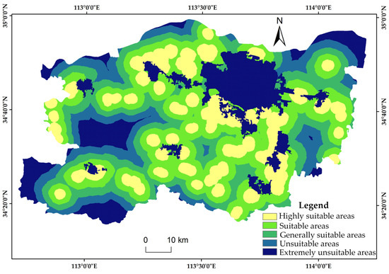 According to the surface source and comprehensive resistance values of rural residential areas in Zhengzhou, the cost–distance model was used to calculate the minimum cumulative resistance of each grid cell to the source of rural residential areas and determine the cost distance. The cost distance is a measure of the relative accessibility of any grid cell to the source of residents in the region, where the minimum cumulative resistance value to the source is considered to be the reachability value. In this paper, the degree of suitability of rural residents’ point sources to the surrounding space is indicated. The results show that the minimum cumulative resistance value of rural residential areas in Zhengzhou ranged from 0 to 63,307. According to the natural breaks method, Zhengzhou was divided based on the minimum cumulative distance values into highly suitable areas (0–4999), suitable areas (5000–11,999), generally suitable areas (12,000–19,999), unsuitable areas (20,000–29,999), and extremely unsuitable areas (30,000–63,307). Urban construction land was automatically classified as extremely unsuitable. The suitability classification results are shown in Figure 4.