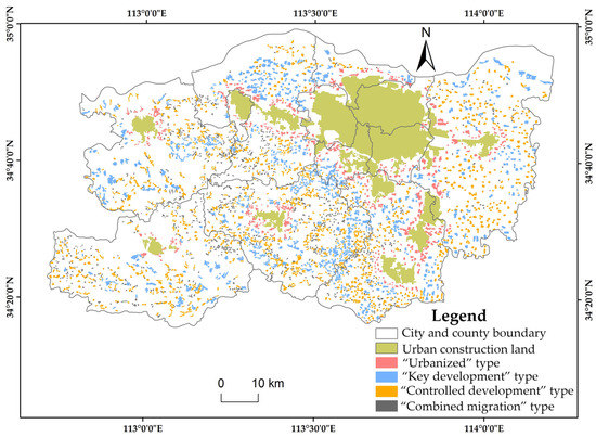 Finally, the four categorized areas were adjusted according to their corresponding plaque areas. If the plaque area of a lower-level rural residential area was more than twice the average area of the upper-level rural residential area, the rural residential area was automatically upgraded by one level. Similarly, if a higher-level rural residential area amounted to less than half the average area of the next-level rural residential area, the rural residential area was lowered by one level. In addition, some rural residential areas that had a certain scale and were difficult to transfer were reserved. The “combined migration” rural residential areas with an area larger than 10 hm2 were re-categorized into the “controlled development” category. The distribution of rural residential area optimization types in Zhengzhou is shown in Figure 5.