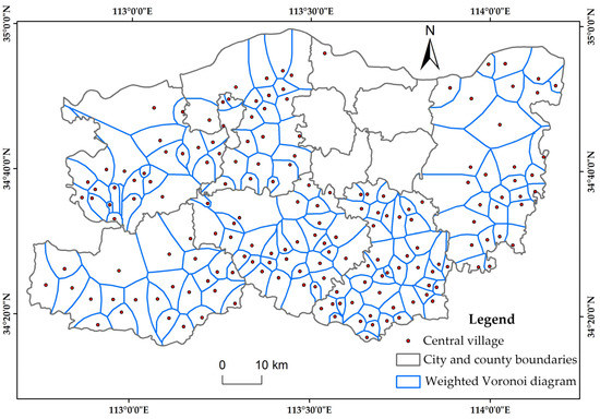In Equation (2), is the weighted Voronoi polygon of point . The weighted Voronoi polygon set V (Equation (3)) corresponding to all points in the set s constitutes a weighted Voronoi diagram of s. Among all polygons, the more significant the weight, the larger the area of the formed Voronoi diagram polygon—i.e., the greater the influence range of the force. Based on the comprehensive consideration of the differences between rural residential areas and their geographical distribution, this method can accurately and intuitively define the affected area of rural residential areas around a central village according to the size of the village’s area of spatial influence.