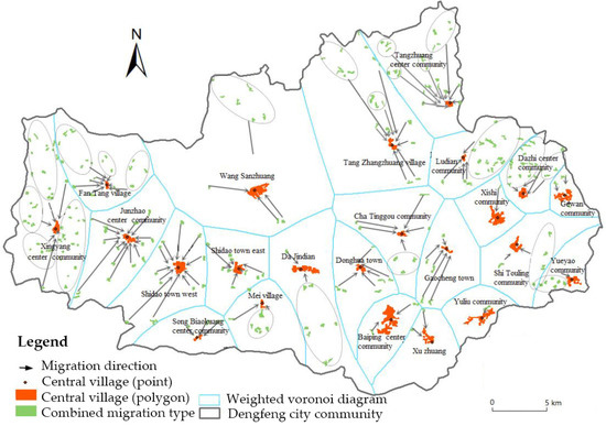 The anti-normalization of the comprehensive resistance value of the rural residential area was then used as the weight value of the influence range of the central point. A weighted Voronoi diagram was generated using the “Weight Voronoi” plugin in the ArcGIS 9.3 software. The spatial constraints of county-level administrative boundaries were increased so that rural residential areas within the administrative area could not be merged or merged across administrative boundaries, and, ultimately, the scope of influence of central villages was determined (Figure 6). Taking Dengfeng, within the boundary of Zhengzhou, as an example, the direction of migration and consolidation of rural residential areas is shown in Figure 7.