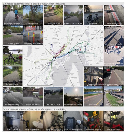 Participant observation among those working for the e-bike scheme was also carried out. The participant observations involved travelling with and talking to these workers and delivering the e-bikes to the informants. Participating in their work contributed to essential knowledge and insight into how the scheme was carried out. The municipality of Bærum recruited 21 informants for this study in the same way as they recruit people and companies to join the scheme, and all those participating in the scheme at the time of data collection participated in this study. The data collection was set for the spring, which is the period when the bike season starts for many people. This was also to avoid the winter, as many people prefer not to bike when it is snowy, icy, and cold. The informants worked in both private businesses and public services. All the travels captured by GPS-trackers and a selection of pictures taken by the participants representing various types of performance and experiences are depicted in Figure 1 (pictures: a–z).