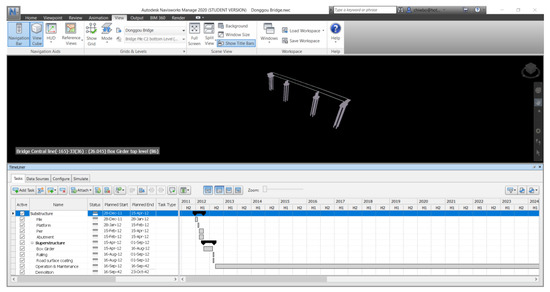 After the model of Donggou Bridge was generated, a new dimension was added to the 3D model. The time factor, as the fourth dimension, is suggested to generate and evaluate the overall constructability [30]. Adding the information on time as the fourth dimension to the 3D BIM model can help to identify possible mistakes or conflicts in the early stages of the project’s lifecycle and help associated stakeholders to optimise the construction as much as possible [31]. After extraction of the 3D model information from Revit 2016, the 4D simulation was completed using the Navisworks software. The construction status was visualised in Navisworks following the preparation of the construction schedule in the early stages, and by editing the actual start and end data in Navisworks during the construction stage, the constructor can adjust the construction progress to delay or proceed with the proposed construction schedule. Figure 3 and Figure 4 show the estimated construction schedule.