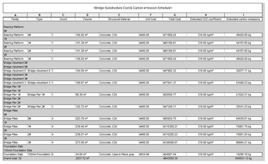 The embodied equivalent CO2 emission from the raw materials was calculated based on the CO2e factors from Hammond and Jones [27]. The CO2 emission results obtained from the BIM 6D Model were 645.55t embodied carbon emission from C30 concrete, 589.41t embodied carbon emission from C50 concrete, and 424.55t embodied carbon emission from rebar materials (see Figure 5, Figure 6 and Figure 7).