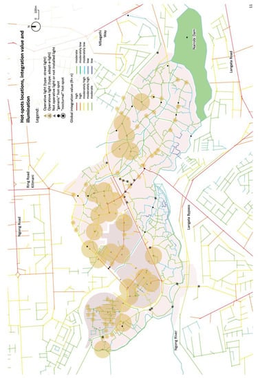 Territorial and local analysis also showed that illumination is an influencing factor for hot-spot location. However, correlating this parameter with the integration value of the street network, a more accurate interpretation is achieved. Specifically, some villages of Kibera, such as Kambi Muri, Kisumu Ndogo, Gatwekera and Raila e Soweto West, are completely without public illumination and the amount of hot-spots in these villages is minor compared to other areas better illuminated. This is probably related to the integration value: most of the street sections are narrow, dark and intricate paths with a low integration value. Then, the movement flow of potential targets is drastically reduced. Thus, criminals in Kibera seem to prioritize street section without illumination that is still close enough to the main movement flows.