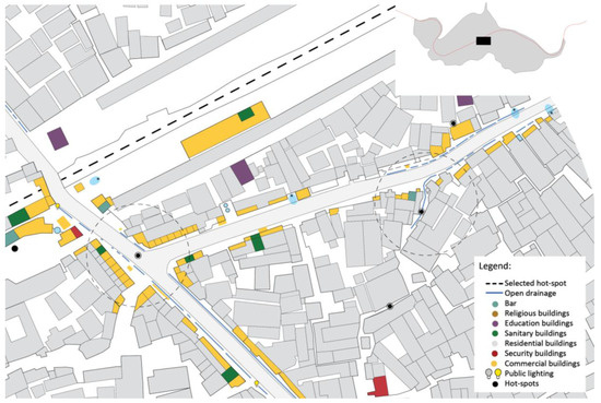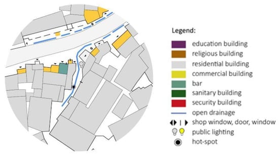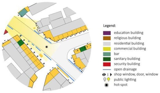 Finally, comparing these findings with the territorial analyses, the first hot-spot represents an exception of the main trends, as it is located on a street section with the highest integration value, but it is consistent with the illumination and the visibility criteria. The second hot-spot fully relates with the findings at the territorial scale. Similarly, several linkages can be drawn between the findings of the two hot-spot areas and the criminology theories previously discussed. The first hot-spot benefits from high people flows and a great number of commercial activities with “eyes on the street”; however, the area has great potential for crime occurrence during the night, when all the activities close [7,8,9]. Regarding the second hot-spot, the area has a moderate risk of crime actions throughout the day, due to the reduced natural surveillance related to the secondary movement flows among this street section [10,11,12,13], the presence of an abandoned building facing the area [13], the lack of illumination and the limited number of openings [7,8].