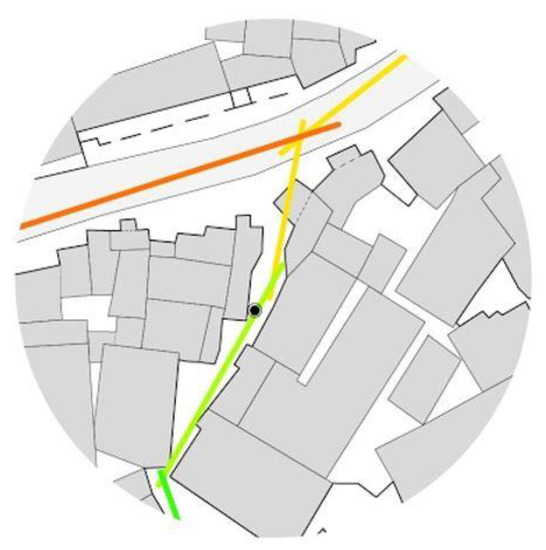 To deepen the findings at the large scale, the following local analyses have been developed on a specific area of the settlement located on the crossing between Sheikh Mahmoud Road, Ali Jaden Road and the railway line. The focus area, illustrated in Figure 6, represents a strategical point of Kibera spatial configuration, where people movements are overlapped. The focus area selection depended on the peculiar concentration of hot-spots and on the findings of the territorial analyses. Indeed, as shown in the previous maps, the integration values, the illumination conditions and the visibility features draw optimal conditions for crime occurrence. The following analyses and compares the location of two hot-spots and their surroundings. The first is placed at the junction between two main roads and has a high integration value (red, while the second is located on a secondary road, visually connected with the main integrated space and with a moderately high integration value (light green). The hot-spots selected are adequately representative among the others, as emerged in the territorial analysis, and thus it is possible to draw some general conclusions about crime patterns in Kibera at the local level.