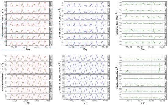 Examples of satellite-based hourly global horizontal irradiance (GHI), locally ground-measured GHI, and irradiance bias (One week of March, July, September, and December 2018).