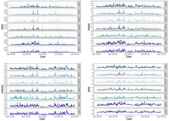 As a preliminary analysis, the irradiance data from both sources are significantly similar. Moreover, both irradiance curves are practically overlapping and, as was expected, a detailed metric analysis was required to compare the different sources in a more extended way. Subsequently, an estimation of metrics is then determined according to Table 1, where a variety of metrics used and proposed by previous contributions is summarized. With this aim, Figure 7 shows the daily evolution of such metrics, depending on each location and with a one hour sample time. Table 2 summarizes some descriptive statistics of the error metrics (including average values, minimum, maximum, and quartiles). These metrics were determined from both irradiation data sources and they provide a variety of alternatives to estimate the differences between the data. From these metrics, a characterization and classification by considering the proposed methodology, as described in Section 2, was carried out by the authors. The results are presented and discussed in Section 4. In addition, PCA was also applied to identify the main relationships among the metrics, reduce the number of variables and allow us a graphical representation of such metrics in a low-dimensional environment.