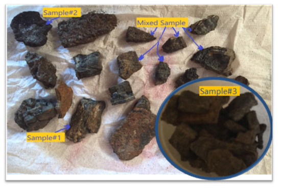 The samples were collected from different locations with different physical shapes. Sample 1 is a dry rigid scale, has regular shape pieces, and was precipitated near or at the well surface. Sample 2 is a black metallic scale, with irregular shapes, and has a noticeable hydrocarbon smell. The third sample 3 is a dry rusty scale, with irregular shape pieces, and does not have a hydrocarbon smell. Samples 2 and 3 were collected from the production separator. Figure 1 illustrates the collected three samples.